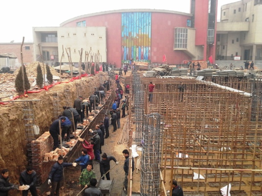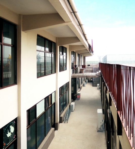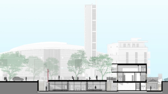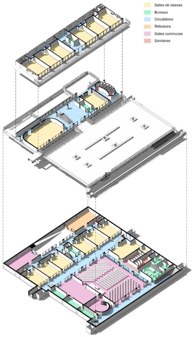 Bâtiment construit en semi-souterrain pour cause de contraintes de disponibilité foncière | Tous les locaux sont éclairés naturellement par un jeu de grandes cours anglaises servant aussi de rue intérieures et reliant les distributions verticales |