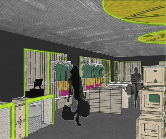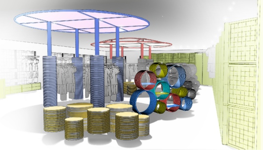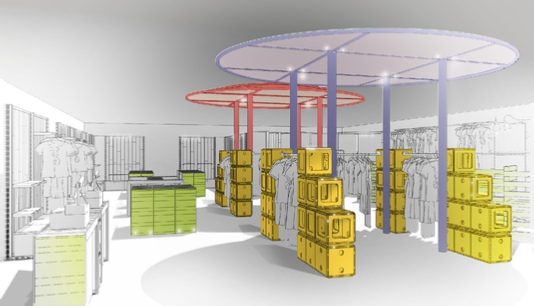 Développement d'un concept de boutiques éphémères thématiques adaptables et évolutives | Utilisation de matériaux et matériels détournés (produits industriels, matériaux de chantiers, matières brutes,…)